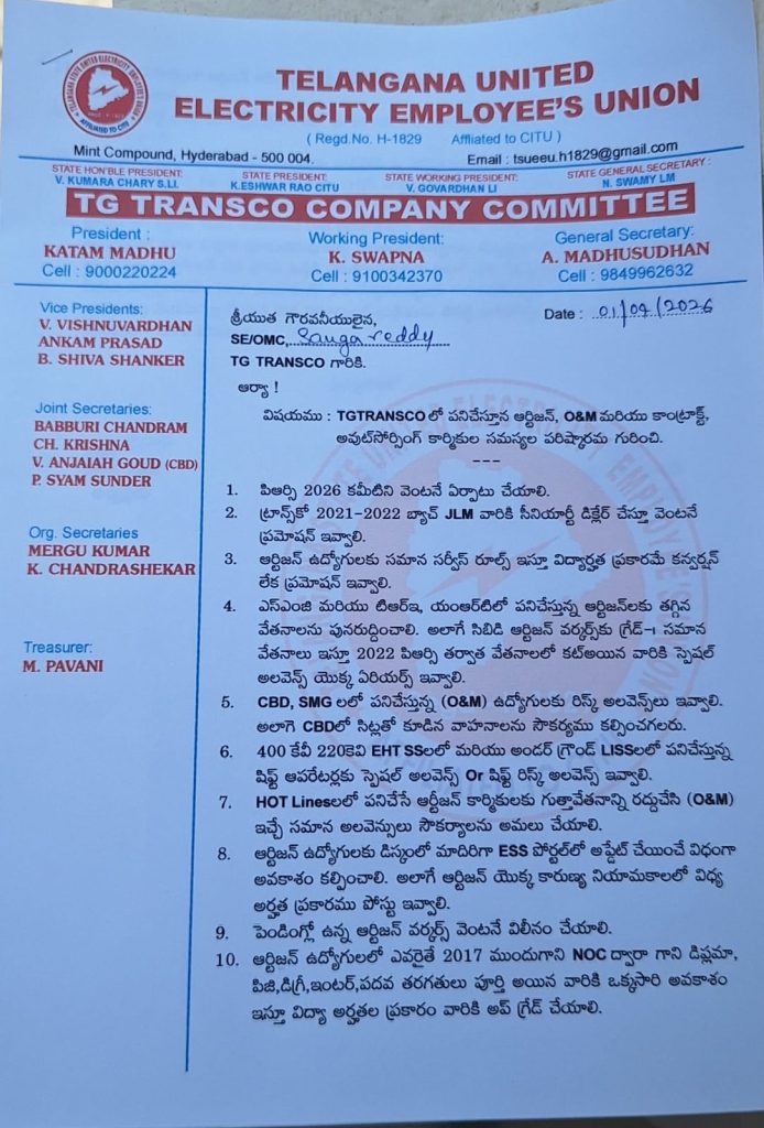 • కొత్త నియామకాలు: ట్రాన్స్‌కోలో సిబ్బంది కొరత తీవ్రంగా ఉందని, పనిభారం వల్ల కార్మికులు అనారోగ్యానికి గురవుతున్నారని యూనియన్ ఆవేదన వ్యక్తం చేసింది. ఖాళీగా ఉన్న పోస్టులను భర్తీ చేసేందుకు వెంటనే కొత్త రిక్రూట్‌మెంట్ ప్రక్రియ చేపట్టాలని కోరారు.